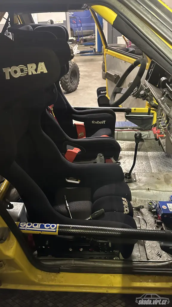 Interiér osazen sedačkou OMP HTE(ušák), 6ti bodové pásy RRS, volant OMP WRC, digitální Dashboard, elektrický posilovač řízení, závodní pedálovka