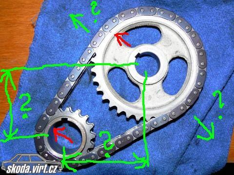 Ta moje fotka je orientacni pac neznam polihu vacky vudci klice to na stole neudelam ze takze cervene sipky mas oznacene dulky a ty zelene jsou prave nezname udaje tudis nevim presny uhel na vackovem kole od roviny na pero pac kdyz dam vys to kolo tak se uhel zvetsuje a kdyz niz tak zmensuje proto ti to bohuzel takhle nejde zmerit. Takze jsem to jen tak zhruba polozil jak asi to je na motoru. Kazdopadne je dulezity tech 12 cepu a neotocit si o celou otacku klikou to bys rozhodil uplne kdyz otocis vackou tak se nic nestane pac zas budes v tom samem miste - ted mi to ale radsi nekdo potrvdte jeste mi to moc po ranu nejde :o)
