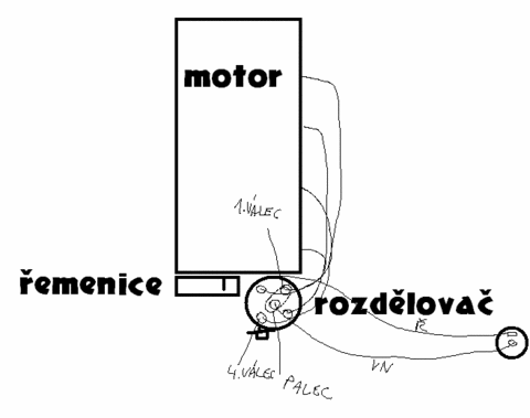 palec v rozdělovači - za jednu otáčku motoru zapalují dva válce a rozdělovač se otočí o půl otáčky.