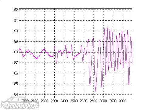 Jinak kousek prubehu teploty ze vcerejska (termostat 88C, Wahler, bez decky, 50-80km/h):