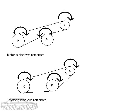 -> Czert: Jo a teď koukám na ten tvůj nákres, tak první obrázek je zapojení plochýho řemenu, ale P není pumpa ale napínací kladka a druhej obrázek je zapojení klíňáku. Jestli jsem to teda dobře pochopil tak je to jeden motor. Kua jdu se na to kouknout...