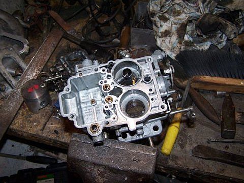 -> Breakz: a takhle vypadá karbec všimni si druhý komory kapku sem ji převrtal a vyhodil difuzor, první je taky převrtaná na benzín to jede jen na první ale na plyn to tahá jak blázen..karbec je to obyč 120 všechno rozdělaný vyčištěný a promazaný