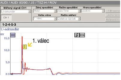 -> COL: tam chybí část popisu, sorry, je to jinak, červená je primár a modrá sekundár, takže jde z toho odečíst jen napětí na sekundáru (špička je tam asi na 10kV)