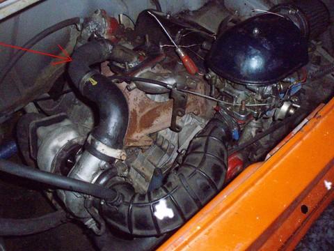 prvy problem vyrieseny...koleno na ktore ukazuje sipka je z vodnej sustavy..koleno ktore ide od vodnej pumpy na suru chladenia ..kusa upravene...problem spociva v tom ze ked rozturujem motor..tak zvysia sa otacky motoru a aj turba...plyn drzim na 1/2vici..mam asi 6tis ot..a ked ho pustim tak vyfukove plyny sa zmiernia...klapky v karburatory sa zatvoria a turbo sa vplyvom podtlaku v sani spomali a niesu vyfukove plyny ktore by ho roztacali..vsani je obrovsky podtlak pac motor znizuje svoje otacky a tuto dadicu mi nenormalne scucne...mozem ja uz potom pridavat plyn kolko chcem motor sa vzchopy az ked klesnu otacky a klesne aj podtlak..ale aj to velmi tazko...musim tam dat najake ine koleno..bud tvrdie aleb plastove alebo kovove ... dufam ze potom uz bude lepsie..a aj na karburator treba spravit nejaky drziak